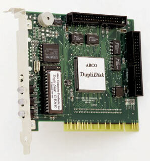 ARCO Computer Products, Inc. has announced the release of DupliDisk-PCI. DupliDisk-PCI is a driverless disk mirroring adapter designed for the PCI bus. The price of this product is $225 US. The DupliDisk-PCI can mirror up to two pairs of IDE, E-IDE or U-IDE drives of any capacity when inserted into a PCI bus slot. It connects via a standard IDE cable either to the IDE connector built into most PCI motherboards today or to an add-in IDE adapter installed on the system. The DupliDisk-PCI is a hardware-based dual-channel adapter. It requires no TSRs or operating system-dependent device drivers.
