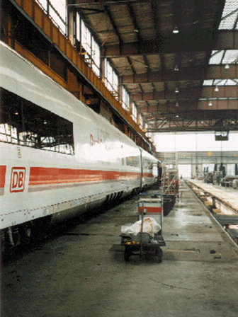 As part of this project, a measuring axle developed and patented by Forschungs- und Technologiezentrum der DB-AG (Minden, Germany) was installed in a regular running ICE to measure triaxial forces in the stand-up point of the wheel. In addition, four accelerometers were installed, three on the axes at the bearing and one in the coach measuring vertical acceleration. In addition, a resolver was attached to the axle. It delivers 1440 TTL-edges for one turn of the wheel. The edges are used to clock 90 A/D conversion for one turn of the wheel, resulting in a sampling rate dependent on the wheel's rotation speed but synchronous with its rotation.