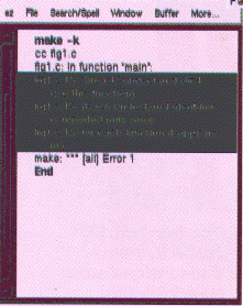 ez has support to assist you in finding compile errors. This is done by invoking make, capturing the output and then asking ez to show you the source lines in error. This is done by creating a second window of the source (select New Window on the Window menu card). In either of the source windows, select Start Compile on the Make menu card. You can see the results in Figure 6. When the compile completes and there are errors, select Next Error on the Make menu card. ez will then switch files to the offending file (if necessary) and show the line identified in error by the compiler. Correct the errors and start the process over again.
