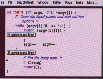 ez is not a complete source browser in the sense of some commercial applications, but rather it provides a set of functions to help you to navigate through your source. Sometimes you don't want to see some parts of your program. Highlight that part of your program with the mouse and select Compress region on the Source Text menu card and you will see something like that shown in Figure 7. If you click in the "compressed lines" box, the code will be shown again. Selecting Decompress all on the Source Text menu card will expand all compressed source areas.