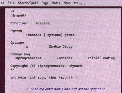 So far we have been talking about editing existing source files. ez provides additional support when you edit a new, non-existent source file, by providing a means for you to control a "template" or default file. Each language has its own template file which can be found in /usr/andrew/lib/tpls. You can tailor your own by creating your own template directory and telling AUIS applications where your templates are by defining the