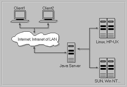 The demands for a multi-platform, secure tool brought us to a simple decision--Java. As we have a strong students' Java team at our lab, Java was chosen as the basic development tool. Java is a network-oriented, robust tool and provides enough security for our requirements. We won't go into details of the language, but it was also clear that Java was not appropriate for the system-level programming needed to access system resources. For that reason, we chose a three-tier architecture (see Figure 1). This architecture represents a response to some of the drawbacks of the standard two-tier client/server network architecture. Client/server applications are quite easy to program; the problem is how to manage client-side software. The problem is even bigger when we require a multi-platform environment. Three-tier architecture introduces so-called middleware (e.g., the Java server in Figure 1). Basically, the middle software residing on the server represents a bridge between a client and a server. The middle tier is not only capable of handling more client connections, but also provides a more secure method of communication. Since the middleware and the client part can be written in Java, we come to a very important issue--platform independence.