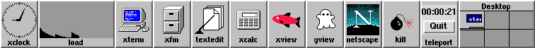 *FvwmButtons(Title 'teleport', Swallow \ (Useold Respawn) "pppui_swallow"\ Nop, Action 'Exec PPPui -name \ "Teleport Connect" -small pppui_swallow\ "/etc/ppp/scripts/ppp-on" \ "/etc/ppp/scripts/ppp-off" ppp0 &')It creates an invocation of PPPui that is swallowed into the button panel after the connection is established, as shown in Figure 2. (Unfortunately, the semantics of FvwmButtons cause the button to appear in a constantly-pressed state when the connection is not active, which is a bit distracting.)
