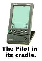 The PalmPilot actually comes in four different configurations. The earlier versions are the Pilot 1000 (the version I now have) and the Pilot 5000. The newer versions are the Pilot Personal and the Pilot Professional. The older versions don't have a backlit display and come with significantly less memory. They can, however, be upgraded. My brother had upgraded the 1000 to 1MB of memory prior to giving it to me. Besides more memory, the new models have version 2.0 of the operating system, and the Professional has a TCP/IP stack and e-mail tools.
