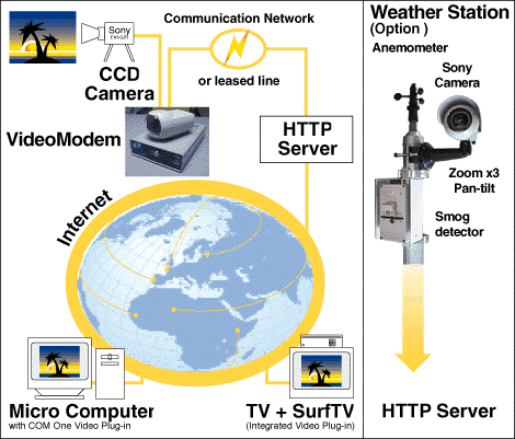 The basic configuration of the ViewSurf service is quite simple (see Figure 2). Each site has a video camera connected to a ViewCOM. The ViewCOM is directly accessible via modem. The caller records a short film segment and uploads it to a web server. For the Beach Report, this operation occurs about three times a day. The browser on the client side must download a plug-in from the COM1 web site in order to display VCR sequences. This plug-in originally existed only for Microsoft Windows and Macintosh, so I wrote a UNIX/Linux version which is now on the COM1 site (available for Linux ELF, Solaris and SunOS).