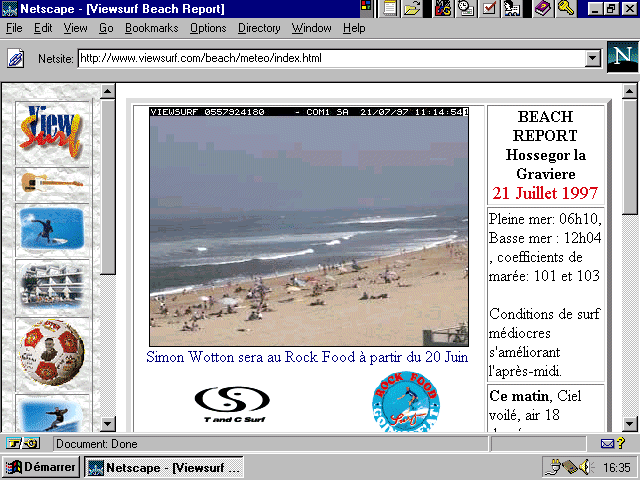 The raison d'être of ViewSurf is to give surfers access to up-to-date on-line weather reports. Classic weather report information is provided, such as temperature and wave status, but the bonus is an up-to-date video that gives the surfer a current picture of what is happening at his favourite beach.