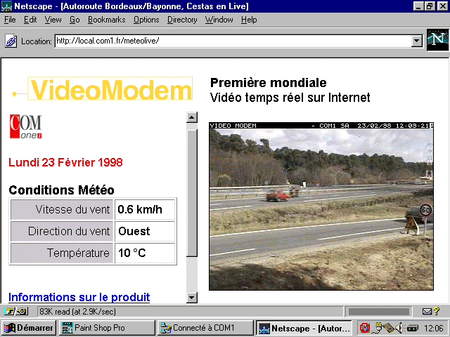 <EMBED SRC="http://your_linux_server:daemon_port" WIDTH=320 HEIGHT=240>The second port is reserved for ViewCOM administration, such as setting brightness or contrast. Additionally, the daemon can control a weather station in order to get real-time information about external temperature, wind speed and other weather information. A VISCA (a standard for video camera remote control) functionality is about to be added to control zoom, pan-and-tilt and other camera parameters directly from the Internet browser. Figure 4 is a snapshot of the Bordeaux/Bayonne motorway on the private COM1 web server.