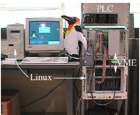 PLC are widely used in the industrial process control environments. (See ``Using Linux with Programmable Logic Controllers'' by J. P. G. Quintana in Linux Journal, January 1997.) They are descendants of relay-based control systems and are built out of modular I/O blocks governed by a dedicated microcontroller. The available modules include digital and analog I/O, temperature control, motion control, etc. They trade off simplicity and low speed for low cost and industrial grade reliability; they are also very nicely integrated mechanically--individual modules pop into a mounting rail and can be installed and removed easily. There are several PLC systems on the market; we currently use the KOYO products.