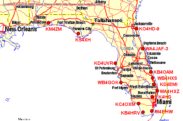 Each line of text in Listing 1 is a packet that contains the amateur radio call sign of the source station, the destination address and any repeaters used in the path. For example, in the first packet shown after the login message, W4DUF is broadcasting to all stations in the APRS network. Due to distance limitations (typically a few miles), other local stations along the route, called digipeaters (digital repeaters), are used to extend the distance by repeating the packet. In the example, stations N4TKT-2, WIDE and N4NEQ-2 are being used to repeat the packet. In this way, distances can be extended to a large metropolitan area (i.e., a 20 mile radius), as well as across the nation by using special high frequency (HF) digipeaters called GATEs. Due to limited RF bandwidth, broadcasting positions nationally is typically limited to special events such as tracking the Olympic torch as it traveled across the U.S.