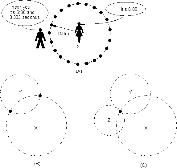 For example, assume you and your friend both have accurate synchronized clocks. At some unknown distance from you, she yells, ``It is now 6:00 and 0.000 seconds.'' When you hear her, your clock shows the time as 6:00 and 0.333 seconds. You can now compute your distance from her as 100 meters by multiplying the speed of sound (300 meters per second) by the elapsed time (0.333 seconds). With this single test point, you are able to compute your distance from the source. Specifically, you are located in any direction 100 meters from your friend. This scenario is shown in Figure 4A by the multiple dots located on the circumference of the circle.