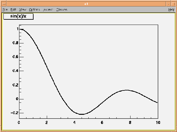 bash$ root root [0] TF1 f1("func1", "sin(x)/x", 0, 10) root [1] f1.Draw() root [2] f1.Dump() root [3] f1.Inspect() // Select File/Close Canvas root [4] .qFigure 1. Output of f1.Draw()