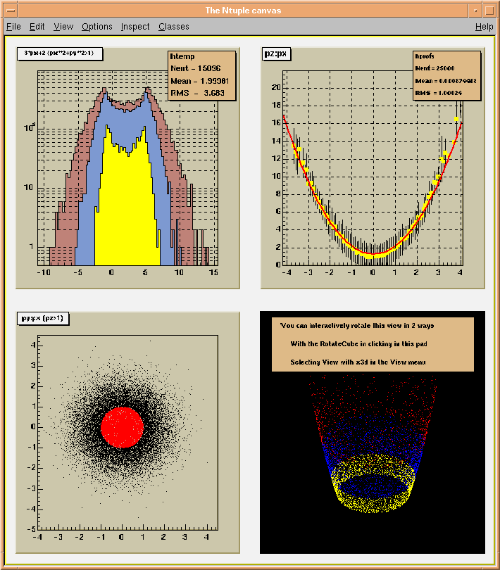 hprofs->Fit("pol2")Moving the cursor over the canvas allows you to interact with the different objects. For example, the 3D plot in the lower-right corner can be rotated by clicking the left mouse button and moving the cursor.