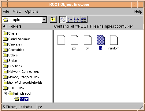 ntuple->Draw("px", "pz < 1")will fill a histogram containing the distribution of the px values for all tuples for which pz < 1. Substitute for the abstract quantities used in this example quantities such as name, sex, age, length, etc., and you can easily understand that Ntuples can be used in many different ways. An Ntuple of 25,000 tuples is quite small. In typical physics analysis situations, Ntuples can contain many millions of tuples. Besides the simple Ntuple, the ROOT system also provides a Tree. A Tree is an Ntuple generalized to complete objects. That is, instead of sets of tuples, a Tree can store sets of objects. The object attributes can be analyzed in the same way as the tuple quantities. For more information on Trees, see the ROOT HOWTOs at http://root.cern.ch/root/Howto.html.