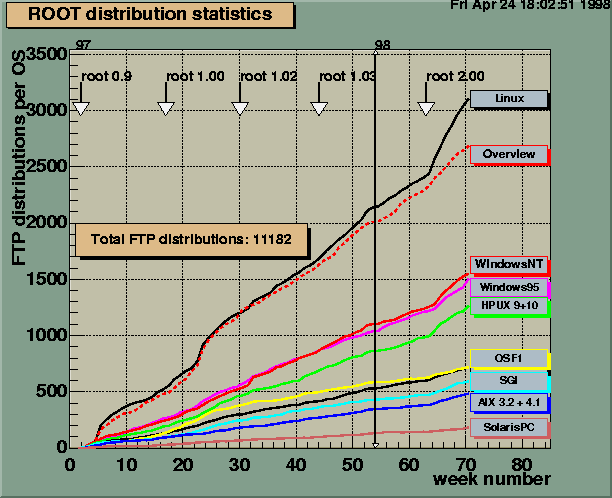 Since the initial release, there has been a constantly increasing number of users. In response to comments and feedback, we've been regularly releasing new versions containing bug fixes and new features. In January 1997, version 1.0 was released and in March 1998 version 2.0. Since the release of version 1.0, more than 9,300 copies of the ROOT binaries have been downloaded from our web site, about 500 people have registered as ROOT users, and the web site gets up to 100,000 hits per month.