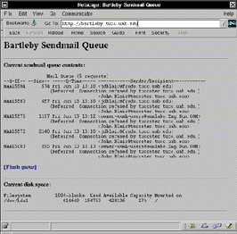 The system as I had it set up was pretty good. However, it did require at least a minimal understanding of the UNIX shell to log in and check or flush the sendmail queue. I wanted to make the system as foolproof as possible in the event something happened while I was away from the office. I settled on a simple CGI script written in Perl. This script (see Listing 2) displays the current contents of the sendmail queue, as well as the output from the df command. This allows someone to see at a glance what e-mail messages are spooled in the system and how much disk space remains. If the sendmail queue is not empty, a link is created that can be clicked to flush the queue.