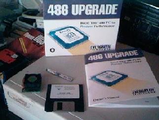 The Evergreen 486 upgrade kit comes in a fairly bulky box, with most of the volume being taken up by pre-formed packing designed to prevent damage to the pins on the upgrade processor. The kit contains the processor assembly, a chip removal tool, a diskette containing a diagnostic program, an instruction manual and a $10 refund voucher (which, in my case, had expired one week before I actually received the kit).