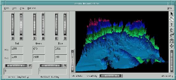 Each SoQuadMesh node in Figure 6 is defined by a set of four vertices, each shared with its adjacent neighbors. These vertices have an associated color component which is smoothed out over the area of the SoQuadMesh. To give some visual indication of the height and to generally make things more interesting, I have set each elevation to have a different color based on a simple formula specified by the user.