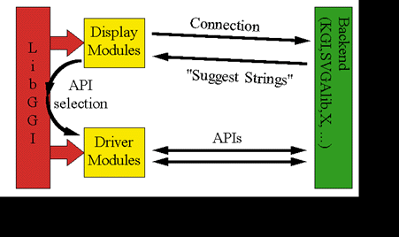 You might be surprised by the term ``set of''. Normally, there are multiple APIs which can be used to draw on a given target. Let me explain this point a bit further for the KGI target, which makes the most extensive use of this feature. Table 2 is the set of suggest-strings for a fictional ABC graphics card being accessed via KGI. The KGI module managing the card will tell LibGGI to first load a ``stubs'' library that is used for emulation when a function is not natively supported. This stubs library contains fall-back functionality, such as making up a filled box from multiple horizontal lines. Then LibGGI loads a library that accesses the linear, 8-bit wide frame buffer exported by KGI. This library will hold primitives such as DrawPixel and override the stubs library. LibGGI will then load KGI's generic ioctl method to access acceleration features. This library will handle functions which are commonly accelerated. The next suggest-string adds a few commands that are rather uncommon, but present in the ABC, which are accessed by the private area of the ioctls. The last library loaded accesses the ABC registers in an exported MMIO region. All the libraries are loaded in increasing order of precedence. The later ones override functions of earlier ones if they can do better. Please note this is not a static process--it can still change at runtime, if necessary.