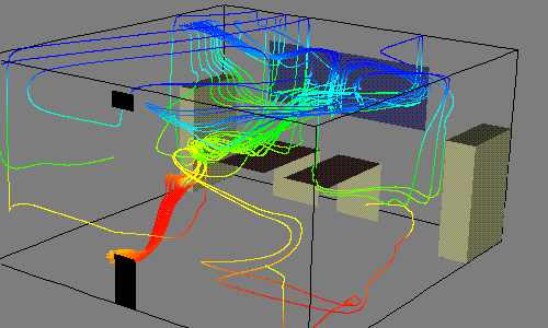 Finally, these last two figures demonstrate some of the advanced features of VTK. Figure 4 is a BMRT-rendered (Blue Moon Rendering Tool) export from VTK. The complex shapes were built entirely from contoured implicit functions. Figure 5 is from the VTK examples directory and shows streamlines emanating from ``seeds'' that are located at a heater vent.