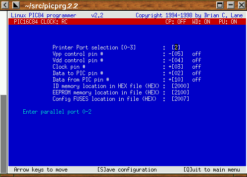 When I first started using the PIC16C84, a compiler was already available for Linux, but no Linux software ran the HOPCO programmer that I use. An easy way to solve this problem would have been to get the DOS software included with the programmer to run under DOSEMU. Since I never seem to pick the easy way, I decided to write a native Linux PIC programmer. I decided on a full-screen ncurses interface, which would run on a VT console or an xterm as long as the TERM environment variable is set to xterm-color.