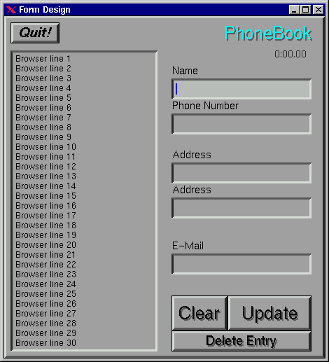 fl_show_form($list,FL_PLACE_FREE,FL_FULLBORDER, "Phone Book");There are also commands to make the form disappear, so it's fairly easy to handle multiple forms. The options you feed fl_show_form include the specific form you wish to display (remember we called ours ``list''), options for the window manager and a title. Once everything is set up and you're ready for the user to interact with the GUI, you then keep calling the function fl_do_forms. Thus, the minimal amount of code you need to display this form is:
