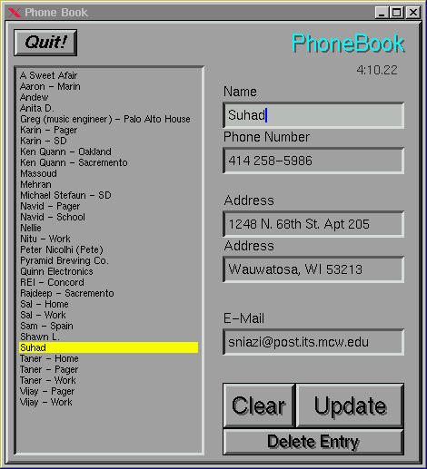 Suhad:414 555-1234:2014 S 102nd St:Milwaukee, WI 53227:sniazi@ucsd.eduNow that the data is loaded, the update_browser call clears the browser and adds the newly loaded names to the browser list. To show the phone book to the user, we make the call to fl_show_form, and then loop through fl_do_forms to let Xforms take over.
