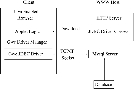 Fewer operations are required to use a JDBC driver without a bridge. In Figure 2, the steps to access a database using a JDBC driver from an applet are shown. The Gwe JDBC driver is used with the MySQL database. The JDBC driver classes are first downloaded from the Gwe host site. Next, the applet logic passes a JDBC call to a driver manager which in turns passes the call to a JDBC driver. The JDBC driver opens a TCP/IP connection with the MySQL database server. Data is transferred back and forth via the connection. When database processing is complete, the connection is closed.