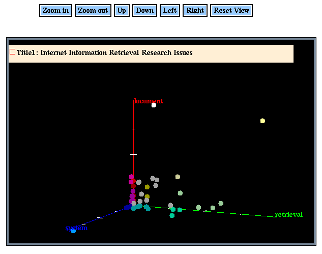 Some of the document collections can be fairly large (over 1500 documents). If a common keyword is entered, the list of matching documents will be large. We display the results from the search engine using Java and JDBC to avoid scanning long lists of matching documents. Java was used to build a 3-D space and plot circles at locations representing the frequency of the occurrences of keywords in a document. JDBC was used to retrieve the titles of the documents stored in a table. Passing all the titles of all documents in the collection as parameters to the Java applet would significantly increase the time to load the applet.