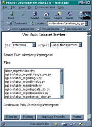 Managing all of these projects and moving them from development server to production soon became a confusing task. Since most of our projects were web-based, we had to move HTML files to the correct HTTPD document directories on the correct servers, CGI executable files had to be specially handled, and we had to maintain libraries of common Python modules. We adopted CVS for revision control, but we couldn't find a general utility to manage even most of our needs, so we wrote a custom tool in Python and Javascript (see Figure 3). The development manager, as we call it, reads a configuration file on the development server which keeps a list of projects, source files and destination locations for publication. It then allows the user to view projects, publish files from the projects, and interface to version control.