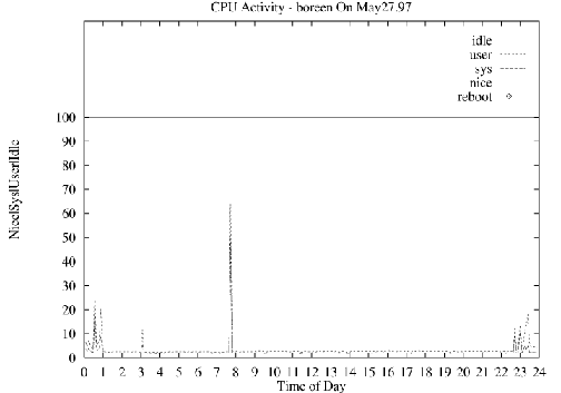 I now had the data, but since columns of figures are boring, I needed a way to look at the data and make sense of it. I had used gnuplot for similar tools on other systems, so it seemed to be a good choice. I started with a script to display CPU utilization, charting the percentages of time spent in idle, user, system and nice states.