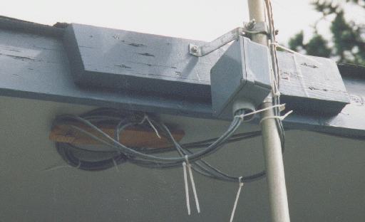 Multi-wire cables from the sensor modules go into the bottom of the junction box, where they are plugged into matching connectors from 100-foot cables which run to the weather display unit. (See Figure 2.) All excess cable is coiled up and attached securely under the eave. Cables going into the junction box were left drooping slightly, to encourage rain to drip off instead of flowing into the junction box.