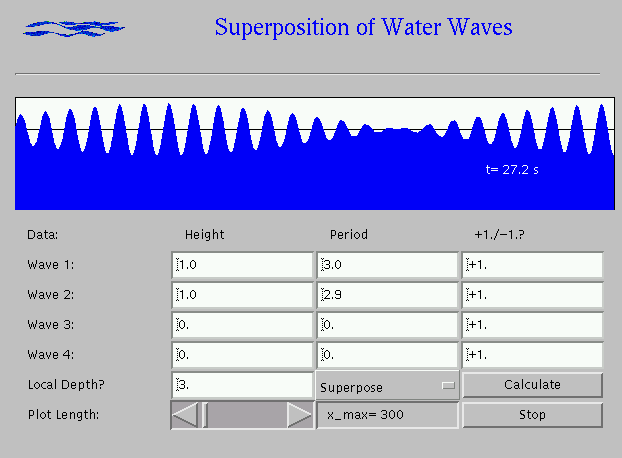 An alternate method is to use a graphical computer program, allowing students to see the result of superimposing wave trains with any frequencies, amplitudes and directions they wish. By trying different combinations of wave amplitudes, directions and wave periods, students can empirically discover the behavior of the water surface. Also, by allowing them to see the separate wave component waves, it is clear, for example, that a standing wave is comprised of two oppositely directed progressive wave trains.
