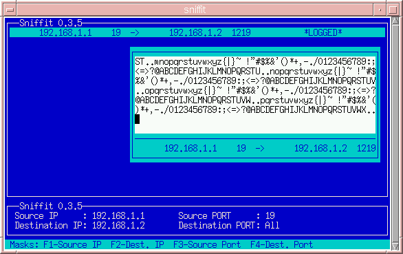 sniffit -iIn Figure 1, you can see two IP addresses: a destination and a source. The source IP is sending packets from port 19 to the destination IP, 192.168.1.2. Notice that port 19 is ``chargen'' and does nothing but send characters. (Packet sniffing works only in situations with high bandwidth.) If the source and destination port are changed to 21, any TELNET sessions from 192.168.1.1 to 192.168.1.2 can be picked up, thus allowing the viewer to see what the TELNET user is typing in his session. If the user is using ssh instead of TELNET, the viewer would see only useless garbage.