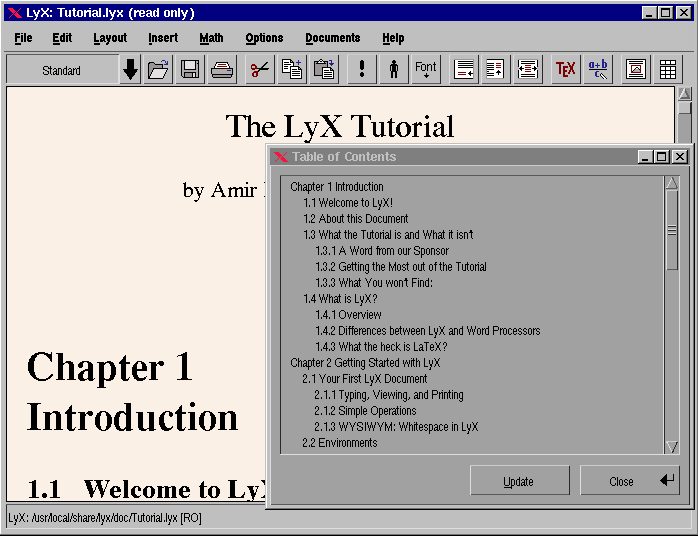 Let's suppose you selected the file Main.lyx. After confirming the message that this file is read-only, it takes a little while to load all the fonts into the X-server. At this point, error messages may appear in your console/shell window. Don't worry; it just means you have not installed all the X-server fonts LyX wants to use. Then, you are presented with one of the really nice features: a table of contents (TOC). A TOC is well-known in LaTeX, but LyX has the ability to display it in a completely interactive window, i.e., you can click with your mouse on any entry and the cursor jumps to the appropriate section (see Figure 2). If you prefer to read instructions on paper, print out the document. Select File/Print, check that everything in the opening dialog box is set to your needs and click on OK (or press enter).
