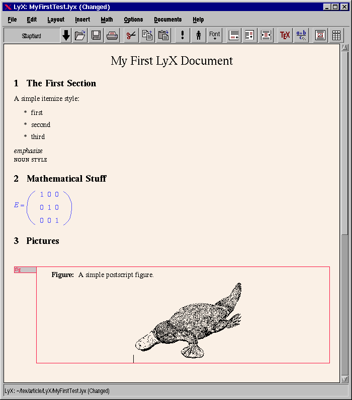 We will add a third section and insert a PostScript picture into our document. First, select Insert/Floats/Figure Float and type in any figure caption. After that (without clicking on enter), click on the ``Insert Figure'' button (just right of the formula button). In the dialog, select the first item (encapsulated PostScript). If you left-click on the appearing frame, a settings box opens. Click on ``Browse'' and select the file /usr/local/lyx/clipart/platypus.eps (or change the path according to your installation). Set the width to 3 inches and click on OK. The platypus should now appear on the screen. You will notice a red frame around the complete figure, with a small grey rectangle to the left reading ``fig''. If you press the left button in this field, the whole figure will collapse into a small, red ``fig''. Left-clicking on this brings back the whole frame. Pressing the left button anywhere within the figure opens the ``Floats'' context menu, giving you a choice of actions to perform.