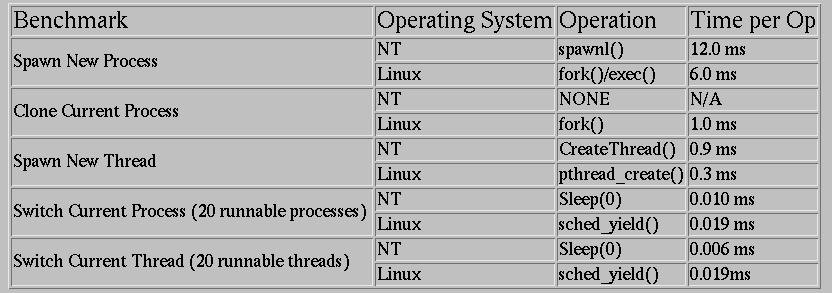 Linux can create a process twice as fast and a thread three times as fast as NT. Process creation takes longer than thread creation (12x for NT, 3x for Linux), because processes have much more overhead. Memory maps and file descriptor tables are just two of the things that must be created for a process (but not for a thread). Note, however, that Linux creates an entire process (the clone function) in about the same amount of time NT takes just to create a thread (1.0 ms vs. 0.9 ms).