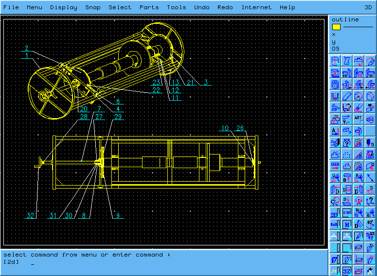 The command line at the bottom of the window reminded me of AutoCAD, but that is the only resemblance. The acronyms varied from those I knew in AutoCAD. Selecting a menu item or icon causes the associated acronym to be displayed on the command line. Commands can also be entered manually using acronyms. Additional parameters are either entered as single letter, digit or symbol options, or by interactive selection of drawing and solid objects.