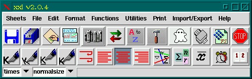 When xxl starts up, two windows are created. The larger one is the spreadsheet and the other is an independent control window containing the icons and menus. Small ``balloon help'' messages appear above each icon when a mouse cursor lingers over it. At first glance, I thought I would be able to create a simple spreadsheet without consulting the documentation, but after several fruitless attempts to enter the formula for the sum of a column, I finally read the PostScript documentation.