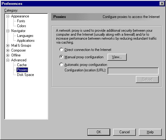 In Netscape Navigator or Communicator, you can include a proxy server and its port for each service to be proxied. With Squid, you can use these settings for the HTTP, Security (SSL), FTP and WAIS services, all with the same port (3128, by default). First, select the ``Manual proxy configuration'' radio button and then the ``View'' button to type in your settings. Figures 1 and 2 show examples of these screens.