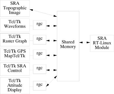 We wrote rgc.c to be a liaison between normal user processes under Linux and the RT-Linux SRA module. Quite simply, rgc sets up a pointer to the shared memory space that the SRA RT module uses for data storage. They understand each other because they share a common .h file defining the data organization in the shared memory space. Figure 11 depicts how the various SRA real-time programs communicate with each other. rgc usually reads commands from stdin and writes to stdout. If it is invoked with certain switches, it forks and polls for RS-232 data and/or writes captured data from the shared memory to disk, all the while taking its commands from stdin. The command set is simple ASCII strings such as set thresh 24 or get roll. The Tcl/Tk programs each open a pipe to their own private rgc, then send commands and receive data back. Everything is done this way except the topographical image display. That program, creep.c (because it creeps up the screen), accesses the shared memory directly. The main reason for concentrating everything into rgc is that it generally means we need only recompile rgc, creep and the SRA module when something is added or removed in the shared memory area. In short, it makes for quicker development.