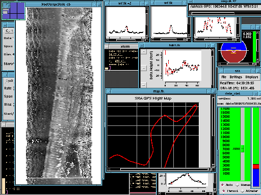 The bright green display shows how we control and designate the operating conditions for the SRA. At this time, we manually find the return signal using the slider. Once found, we click the ``auto'' button and the system will keep the ground in the center of our digitizer window, regardless of aircraft altitude variations. The flight map is yet another short Tcl/Tk program. It extracts GPS position data from the shared memory area and uses it to map our position.