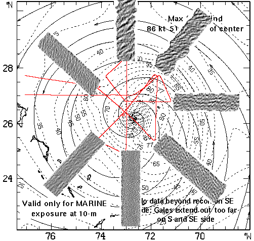 We flew two missions in hurricane Bonnie: the first on August 24 and the second during landfall on August 26, 1998. During our first transit flight from Tampa to the storm, we were able to isolate and correct the tracker bug and everything started working better than expected. Soon after leaving the east coast of Florida, our topographic display of the sea came alive for the first time, showing real sea state. Ocean waves as high as 63 feet were observed in the northeast quadrant of the hurricane on the 24th. Figure 14 shows our August 26 flight track during landfall overlaid on the aircraft weather radar image and a contour plot of the wind field data. The base image includes the weather radar, the wind field and the coastline and was provided by the Hurricane Research Division (HRD) of the NOAA Atlantic Oceanographic and Meteorological Laboratory (AOML) in Miami. We produced this overlay using Yorick.