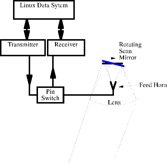Waveform data are extracted from the digitizer after a radar pulse event has occurred. One of the 16C65A microcontrollers controls all aspects of triggering the transmitter, actuating various gates, triggering the waveform digitizer and finally interrupting the Linux waveform digitizer interrupt handler.