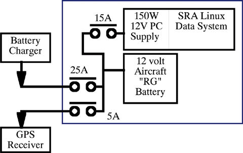 Figure 4 is a block diagram of the SRA power system. The SRA requires an uninterruptible power source for Linux and the three differential GPS receivers and computers. Instead of an off-the-shelf UPS, we went with a 12-volt 25 AH ``RG'' (recombinant-gas) sealed aircraft battery as the prime power source for the system. This was chosen for two reasons: