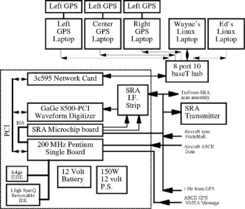The new SRA data system, built on top of a Red Hat 4.2 system and Linux kernel 2.0.29, occupies eight inches of vertical rack space, weighs about 40 lbs, runs totally from an internal 12-volt aircraft battery and requires about 120 watts of total input power. It includes a custom ISA board with several PIC microchips which perform dedicated functions for the radar. It also includes the entire radar IF (intermediate frequency) strip, detectors and a 2ns/point waveform digitizer. No monitor or keyboard is directly connected to the SRA; instead, Linux laptops are used for all control and display. Those laptops run Red Hat 5.1 and 2.0 Linux.