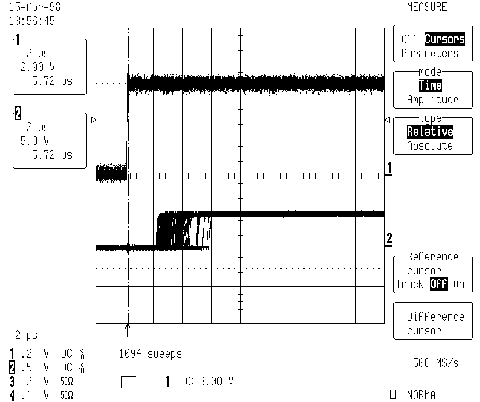 The RT-Linux interrupt typically responds in 2 microseconds (on our 200MHz Pentium) with occasional jitter to several microseconds. When we did this same test with MS Windows a couple of years ago, we found the fastest response to be on the order of 50 microseconds (486-dx2 66MHz) with jitter well into tens of milliseconds. It is incredible just how responsive Linux is to interrupts. Figure 9 is a digital scope capture, where the top trace rising edge is the actual hardware interrupt signal on the ISA backplane. The bottom trace is a hardware signal generated by the interrupt code. It simply wrote a ``1'', waited awhile, then wrote a ``0'' to the printer port. Each horizontal division is 2 microseconds. This demonstrates the typical latency of our RT-Linux system. Concurrent with this test, we ran a find command in another xterm so the system had something to do.