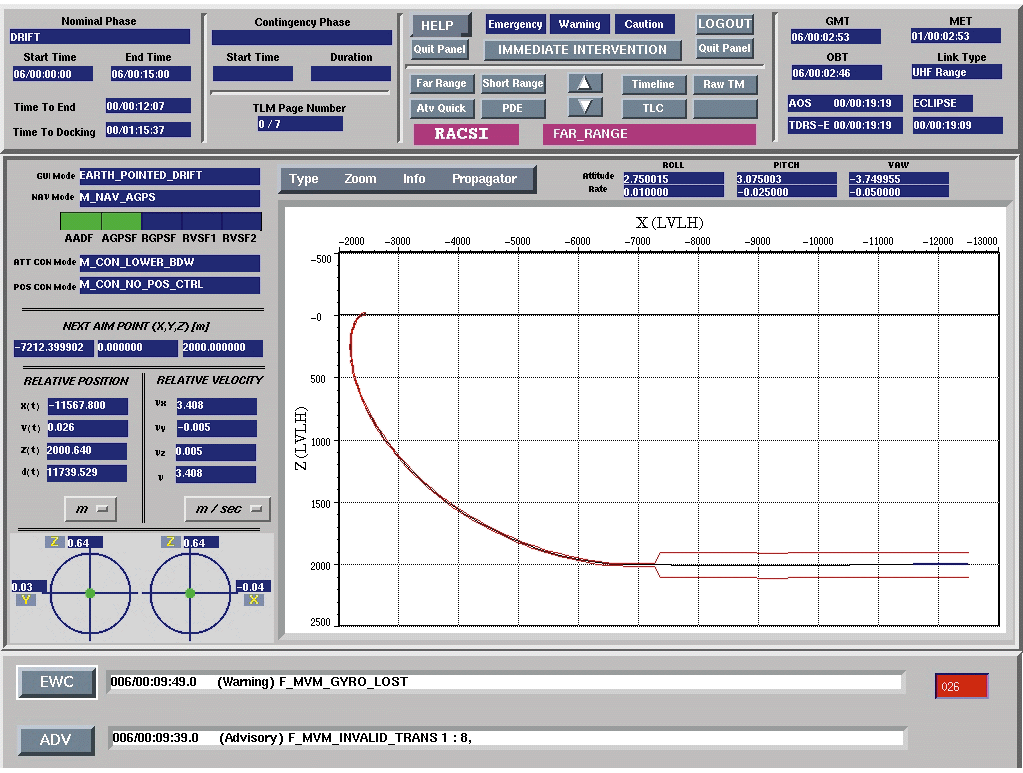 Mission Replanning: the purpose of this function is to support the operator intervention when the mission needs to be changed. It is a feature not present in RACSI--an astronaut cannot replan a mission; only the ground control center can. The Replanning function is launched on request. It supports the ground operator in the definition of a new mission plan according to three items: replanning scenario, mission constraints and status of the chaser equipment. This function can be run in automatic mode (the computer replans a whole new mission without operator intervention), semi-automatic (the operator is asked for some parameters) or manual (the operator constructs the maneuver sequence step-by-step). Visual information is constantly displayed to the operator.