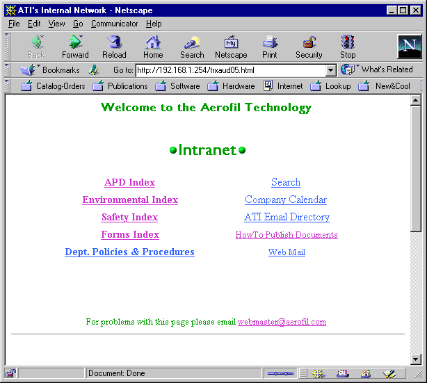 In June of 1998, the company hired a college student for the summer to assist in getting our existing documents on-line. Some of the documents were in a word-processor format, some were flowcharts done in Visio, and some existed only in paper form. Several methods were used to get this information onto the computer: scanning, converting to PDF format and coding in HTML. Basically, I set up various user areas to segregate the documents, such as Human Resources, Information Services, Aerofil Process Descriptions, Quality Control, Safety Process Descriptions, etc. Each area had security set up to ensure that only designated users could add or modify the information contained in it.