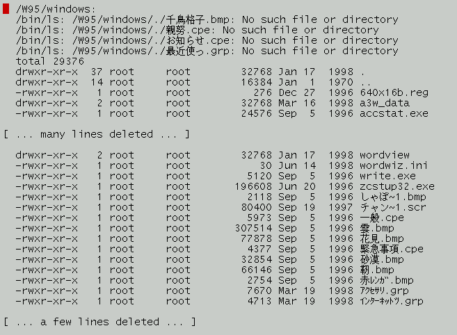 One can imagine various solutions to the problem such as redesigning file system calls to be aware of various encodings, using a universal encoding such as Unicode, or removing dependence of the operating system on such special characters by defining a path data type as a list of strings. However, these solutions would preclude backward compatibility and compatibility with alien file systems and would be something of a burden to programmers. Fortunately, a fairly satisfactory solution is to use a transformed encoding that sets the eighth bit on non-ASCII characters. The major Asian languages have such encodings (EUC), as does Unicode (UTF-FSS, officially UTF-8). By definition the ISO-8859 family of encodings, all of which contain U.S. ASCII as a subset, satisfy this constraint without need for transformation. Using a transformation format is rarely a burden on users, as they generally need not be aware of which encoding format their language is using. However, this difficulty can still apply to mounting alien file systems, especially MS-DOS and VFAT file systems, where Microsoft has implemented idiosyncratic encodings such as Shift-JIS for their localized extensions of DOS and MS Windows. A partial directory listing of a Japanized Windows 95 file system mounted as an MS-DOS file system on my Linux system is shown in Figure 1, a Dired buffer in Mule. Note the error messages at the top of the buffer. ls is unable to find a file name it just received from the file system. When the directory listing is made, one pass generates a list of file names, which includes Shift-JIS-encoded Japanese names. When the list is passed back to the file system to get the file properties, some of the octets of Japanese characters are interpreted as file system separators. Thus, the Japanese character is not found and the error message results. The VFAT file system does not exhibit this problem in this case; I am not sure why. Most characters are passed unscathed, as you can see.