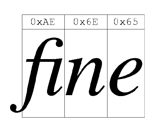 Human readers do not normally have serial interfaces for electronic input of bit strings; instead, they prefer to read a visual representation. A font is an indexed set (not necessarily an array, because there may be gaps in sequences of the legal indices) of glyphs (character shapes or images) which can be displayed on a printed page or video monitor. The glyphs in a font need not be in a one-to-one correspondence with characters and do not necessarily have semantic meaning in the native language. For example, consider the word ``fine''. As represented in memory, it will consist of the string of bytes ``Ox66 Ox69 Ox6E Ox65''. Represented as a C array of characters, it would be ``fine'', but as displayed after formatting by TeX in the PostScript Times-Roman font, it would consist of three glyphs, ``fi'', ``n'' and ``e'' as shown in Figure 2.